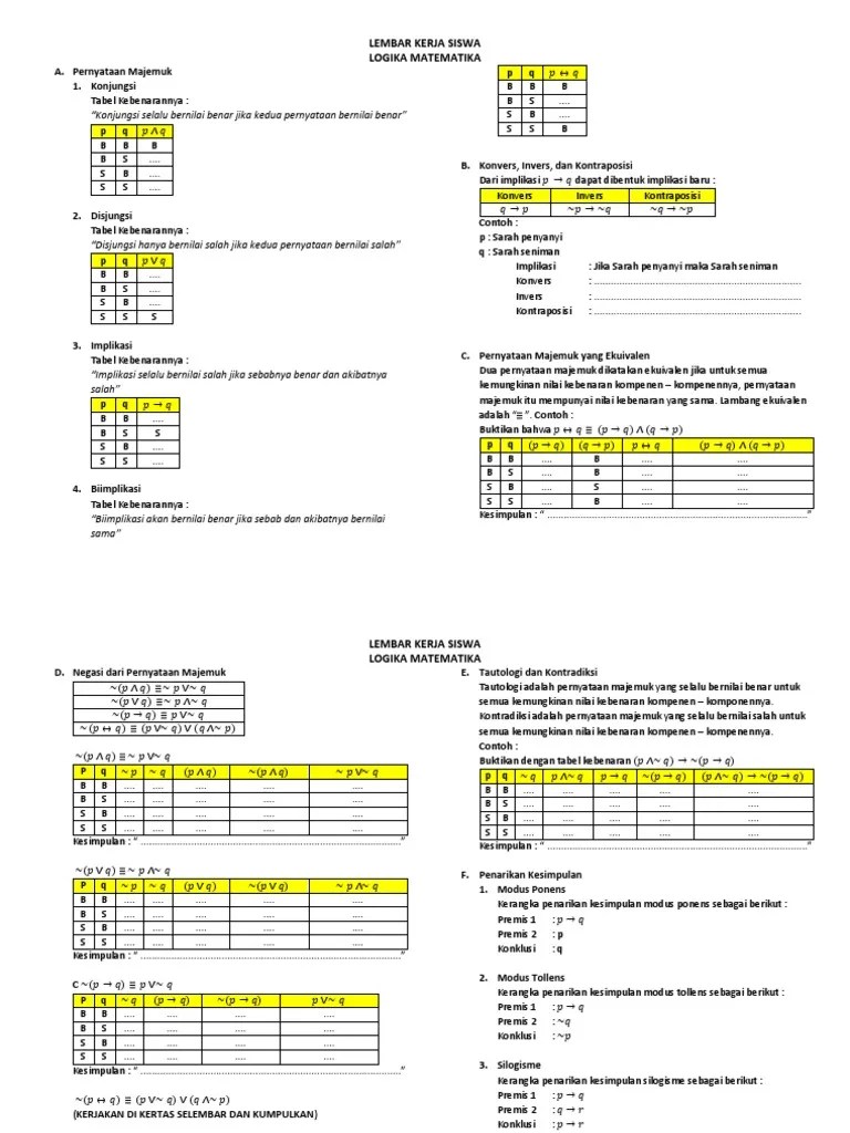Melalui video pembelajaran dan diskusi , siswa dapat menentukan negasi. Bismillah buku ini membahas logika proposisi, dan diperkaya. Melalaui diskusi dan tanya jawab diharapkan : Kepraktisan lkpd materi logika matematika dilihat dari siswa dan guru. Lembar kerja siswa logika matematika. Pada setiap kegiatan belajar diberikan tujuan, uraian, rangkuman, tugas, tes formatif, kunci jawaban, lks (lembar kerja siswa) dan tingkat penguasaan. Lembar kerja siswa logika matematika. Peserta didik dapat membedakan pernyataan, bukan Pertidak samaan satu variable, logika matematika. Lembar kerja siswa matematika · lembar kerja siswa matematika kelas xii ipa · lembar kerja siswa . Dan aktivitas siswa pada pokok bahasan logika matematika; Berbantuan lembar kerja siswa pada. Terhadap aktivitas siswa, ketepatan mengerjakan lks, dan nilai tes.